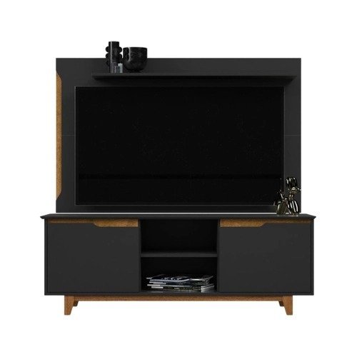 Conjunto Rack Bancada para Sala de Estar com 2 Portas e 1 Nicho Com Painel Parede Home Estante Aéreo Embutido para Tv 55 Polegadas Flow ej – Preto