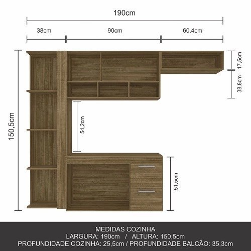 Medidas da Cozinha Montada: A:150,5cm L:190cm Profundidade do Balcão:35,3cm Profundidade da Cozinha: 25,5cm