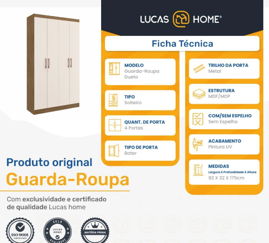 Sejam bem-vindos(as) a Lucas Home! O Armário Multiuso Dueto foi desenvolvido para oferecer total conforto e comodidade para você e sua família. Além de seu bonito visual, que destacam a beleza do móvel e o deixam mais atraente. O produto é todo fabricado com mdp, material de alta qualidade que confere a boa resistência e durabilidade à peça. especificações técnicas: – Material da Estrutura: mdp; – Material das Portas e/ou Gavetas: mdp; – Quantidade de Espelhos: Não possui; – Material das Corrediças: Metálica; – Quantidade de Gavetas: Não Possui; – Quantidade de Portas: 04 Portas; – Tipo do Puxador: Externo; – Acabamento: Pintura uv; – Produto Precisa de Montagem? (Sim/Não): Sim; – Garantia: 03 Meses; – Instruções de Cuidado: Limpar com uma flanela levemente úmida; – Medidas (LarguraXProfundidadeXAltura): 92x32x175cm. importante: imagens meramente ilustrativas. (a lucas home não trabalha com móveis planejados. Podendo haver pequenas variações nas medidas e cores do produto/A cor do produto poderá variar de acordo com a tela de visualização/Os enfeites, eletrônicos e decoração não acompanham). A lucas home não disponibiliza no momento o serviço de montagem, sendo de total responsabilidade do comprador. A lucas home Recomenda que a montagem seja feita por um profissional da área. atenção: Verifique se as dimensões dos produtos passam por elevadores, portas, escadas e corredores. A lucas home Não se responsabiliza pelo transporte dos produtos por escadas, guinchos, içamentos ou quaisquer outros meios específicos de transporte.