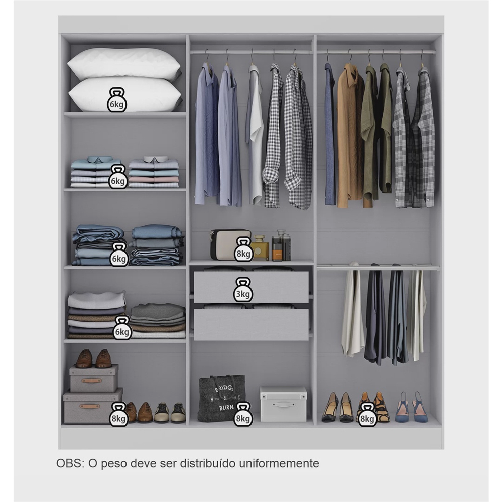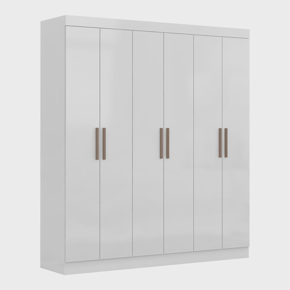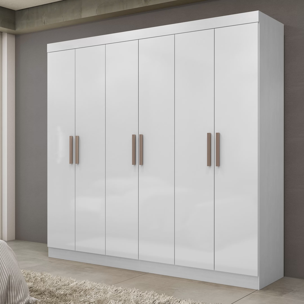 Durabilidade é a palavra para o guarda roupa Paris 6 portas, desenvolvido em material ecologicamente correto, o produto possui 6 portas de abrir que no padrão de 2 cores fornece a opção flex de montagem, podendo alterar a ordem das portas laterais e centrais. A parte interna conta com cabideiros e calceiros de madeira com padrão na cor cinza, 5 prateleiras e 2 gavetas de corrediças metálicas com pintura epóxi, material que proporciona maior resistência e proteção ao produto.