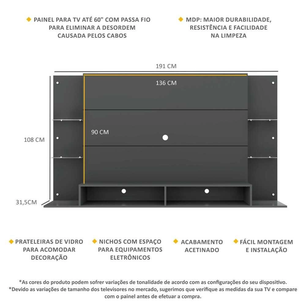 | Produto Composto por | 1 Painel para tv, 1 Kit com 04 Prateleiras de Vidro, Manual de Montagem e Kit Ferragem. |