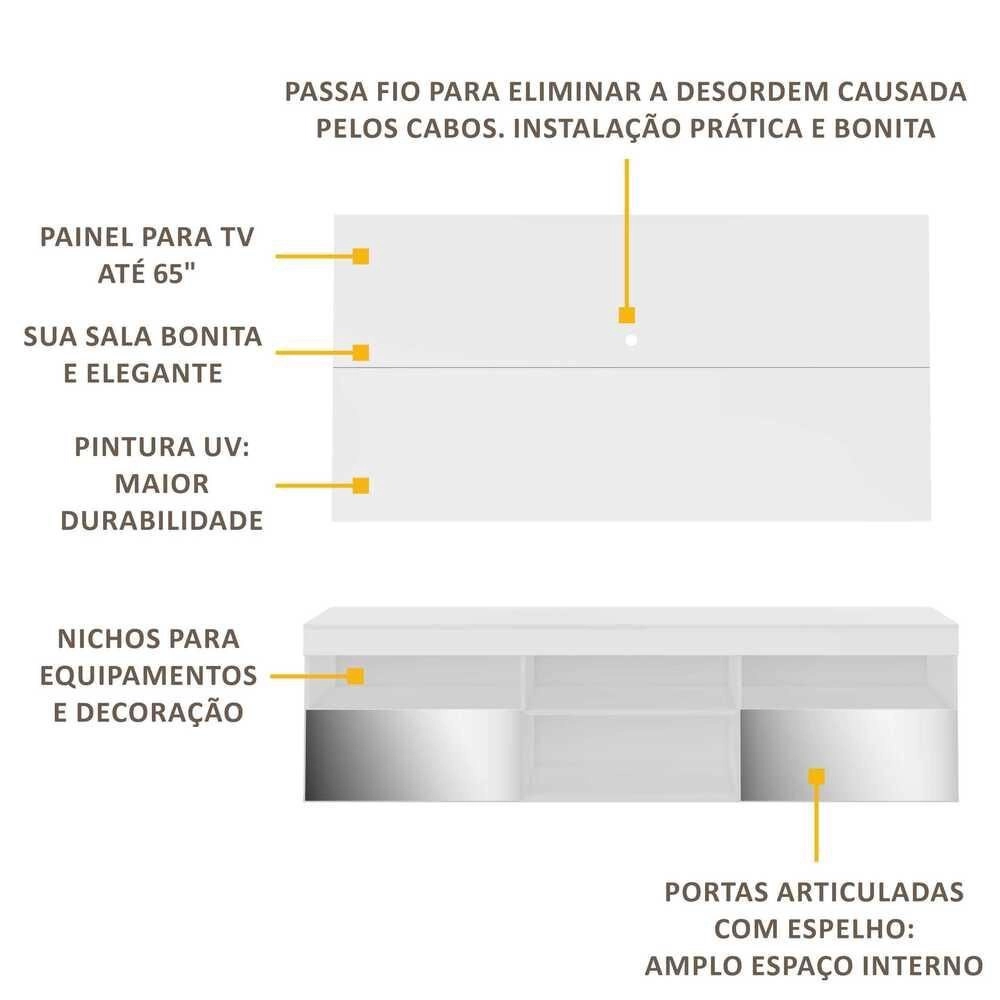 Produzido em mdp com pintura uv, que garante maior durabilidade e facilidade na limpeza, possui espaço para os equipamentos eletrônicos e nichos para objetos decorativos, além de duas portas articuladas com espelho e um amplo espaço interno para manter seus pertences organizados. O painel p/tv de até 65 possui espaçamento para passagem dos fios, que permite deixar os cabos mais organizados. Devido as variações de tamanho dos televisores no mercado, sugerimos que verifique as medidas da sua TV e compare com o painel antes de efetuar a compra. Os espelhos são de vidro (o que evita que a imagem fique distorcida) e lapidados, ou seja, passam por um processo para que as bordas não fiquem cortantes, o que garante maior segurança.
