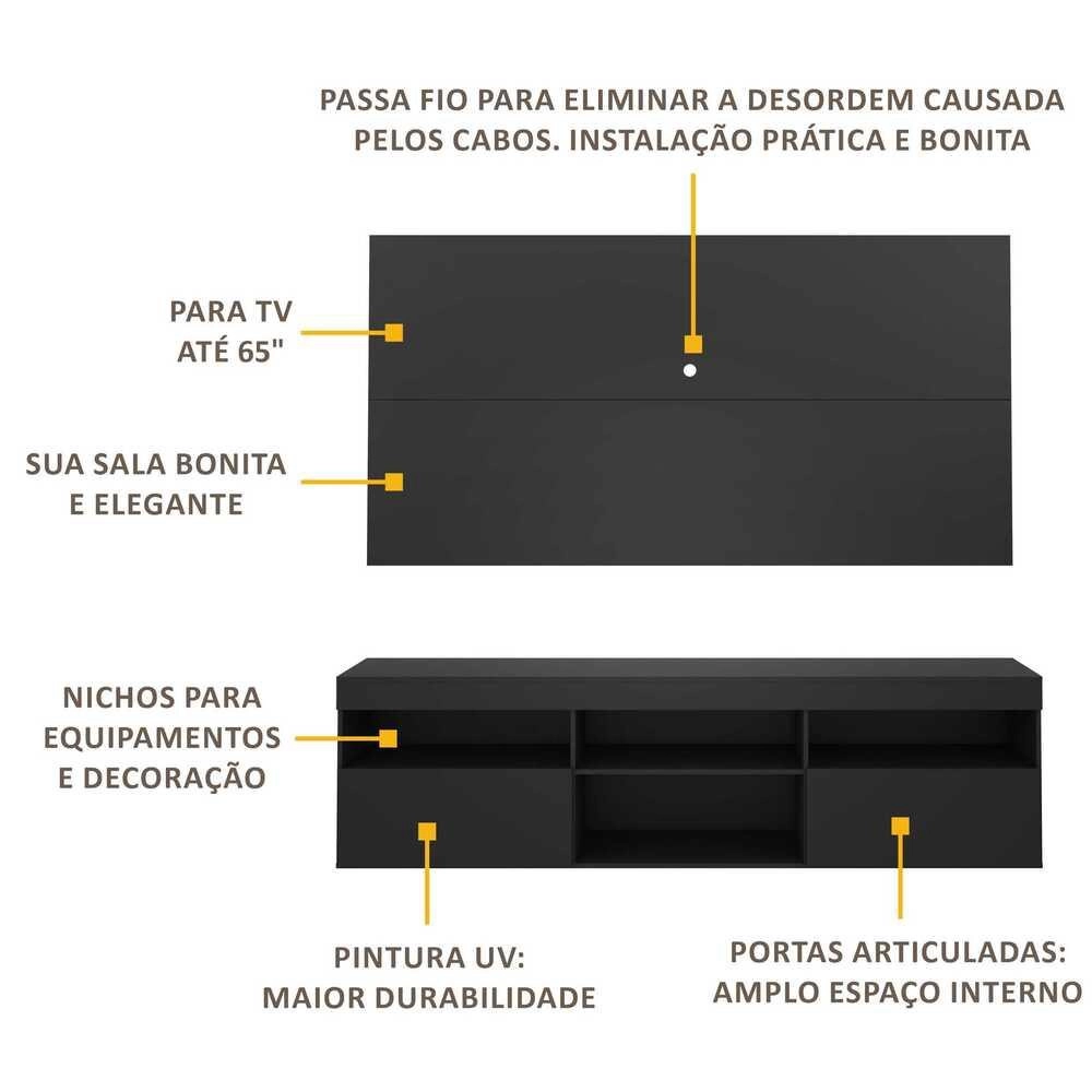 Produzido em mdp com pintura uv, que garante maior durabilidade e facilidade na limpeza, possui espaço para os equipamentos eletrônicos e nichos para objetos decorativos, além de duas portas articuladas com um amplo espaço interno para manter seus pertences organizados. O painel p/tv de até 65 possui espaçamento para passagem dos fios, que permite deixar os cabos mais organizados. Devido as variações de tamanho dos televisores no mercado, sugerimos que verifique as medidas da sua TV e compare com o painel antes de efetuar a compra.